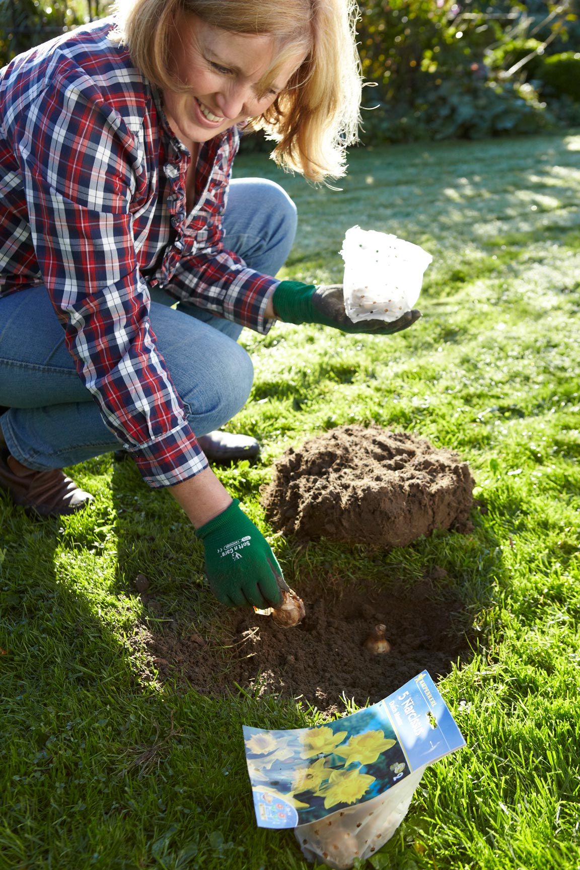 Die Pflanzzeit ist von September bis zu den ersten Frösten im November. Ich nehme dafür einen konisch geformten Spaten und setzen die winterharten Narzissen-Zwiebeln in Gruppen, je nach Zwiebelgröße etwa 10 bis 15 cm tief in den Boden.